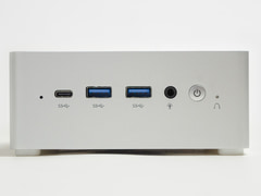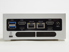 前面にUSB 3.0 Type-C(データのみ)、USB 3.1×2、3.5mmジャック、電源ボタン。背面に電源入力、電源入力、HDMI、USB Type-C(データ/PD出力/DisplayPort Alt Mode)、2.5GbE×2、HDMI、USB Type-C(DisplayPort Alt Mode)、USB 3.1×2、ロックポートを配置。裏はVESAマウンタ用のネジ穴がある。