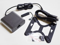 付属品は、ACアダプタ(サイズ約80×80×30mm、重量278g、出力19V/6.32A/120.08W)、HDMIケーブル、VESAマウンタ、2.5インチSSD/HDD用SATAケーブル。BIOSは起動時に[DEL]キーと一般的だ。
