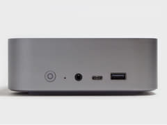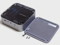 今回手元に届いたのはSpace Gray。筐体は金属製で質感も良く、なかなかカッコいい。また両サイドにスリットがなくスッキリした印象を受ける。iPhone 13 Proとの比較から分かるように、これまでご紹介したNUCタイプとしては少し大きめ。重量は実測で778g。ACアダプタと合わすと約1kg。これも若干重めだ。とは言え持ち運べないサイズ/重量感ではない。出先にモニター、キーボード、マウスがあればハイパフォーマンスで作業することができる。