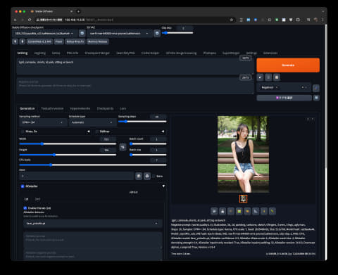 “1girl, camisole, shorts, at park, sitting on bench”と入力、[Submit]ボタンを押し、いったん英文化した後、UpscaleされたPromptは以下のようになる。