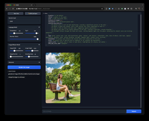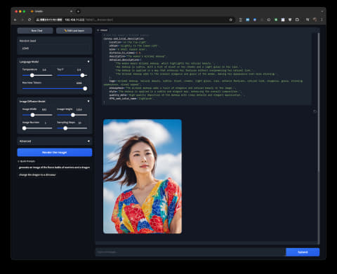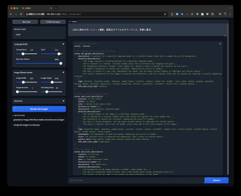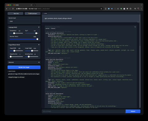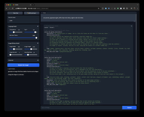おそらく英文が得意な人でも、ここまでは書かないだろう的な内容になっている(笑)。LLMがあの少しのタグからこれだけのことを連想して生成しているというわけだ。この後、画像を生成する時は[Submit]ではなく[Render the Image!]のボタンを押す。なるほど、それっぽい絵が出てきた。