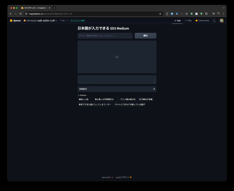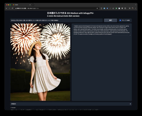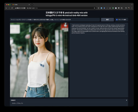 sd3-with-LLMは、あるふ氏が、SD3 Mediumを日本語で扱えるよう、LLMに「microsoft/Phi-3-mini-4k-instruct」を使ったWeb UIとなっている。UIを見れば分かるように、日本語でPromptを入れ[実行]ボタンで英語へ翻訳しつつ結果の画像と、元になっているUpscaleされた英文も表示される。SD3 Medium未体験の方もこれで簡単に試せるので是非!
