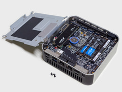 次に内部に金属製のパネルが1枚。これも四隅のネジを外せば、SSDやメモリにアクセス可能となる。ただし、アンテナ線が付いたままなので扱いには要注意。驚くことに、メモリとSSD、どちらにもCrucial製が使われている。