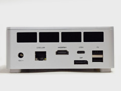 前面は、電源ボタン、USB 3.2 Gen 2 2基、3.5mm音声入出力。背面は電源入力、2.5GbE、HDMI、DisplayPort、USB4、USB 2.0 2基を配置。裏は四隅にゴム足と中央付近にVESAマウンタ用のネジ穴がある。