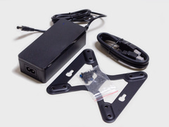 付属品は、ACアダプタ(サイズ約120×52×33mm、重量246g、出力19V/3.42A)、HDMIケーブル、VESAマウンタ。