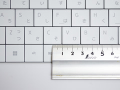 キーボードはOFF+1段階のバックライト付きJIS配列(オプションでUS配列も可能)。写真からも分かるように隙間が少なくフラットな感じだ。打鍵感は硬過ぎず柔らか過ぎず、ストロークもそれなりで、個人的には好み。歪な並びもなく、キーピッチは19mm近くあるので打ちやすい。