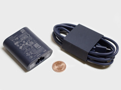 付属のACアダプタはサイズ約66×57×22mm、重量102g、出力60W。もちろん同出力以上のアダプタがあれば他社製品でも充電できる。