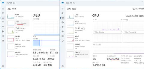- タスクマネージャーを見るとメモリ63.5GB、GPU 36.2GBとなっている