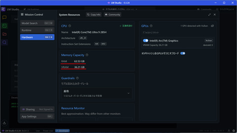 - LM StudioのMemory CapacityがRAM 63.53GB、VRAM 36.21GBとなっている