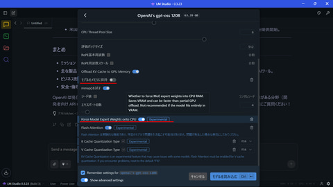 十分なVRAMがなく、モデル全体をGPU専用メモリにロードできない場合は、この方法が有効です。そういったケースでは、高度な読み込み設定で「Force Model Expert Weights onto CPU」オプションをオンにしてみてください。(省略)