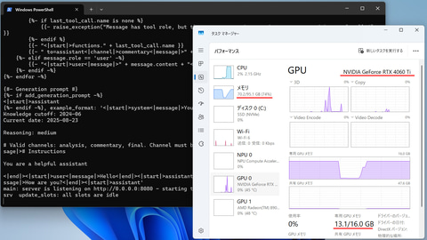 とある。この設定により、アテンションのみGPUへ、ほかはCPUへ乗ることになる。百聞は一見に如かず。動作中の画面キャプチャをご覧いただきたい。