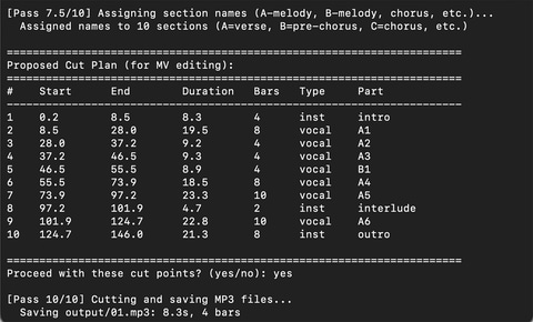 Pass 5は、ジャストで切るとビートが乗ることもあり、マージするとポップノイズが出るため。従って前後で音量の一番低いところでカットするようにしている。実際解析した結果はこの通り。これでちょうどいい感じにカットしたMP3の用意はできた。ただし、このAI判定によるMP3カッター自体はまだ未完成。曲によっては動かなかったりする。
