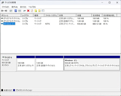 M.2 2280 1TB SSDはCrucialの「CT1000P310SSD8」。仕様によると、シーケンシャルリード7,100MB/s、シーケンシャルライト6,000MB/s。CrystalDiskMarkのスコアもそのまま出ている。C:ドライブのみの1パーティションで約930GBが割り当てられ空き880GB。