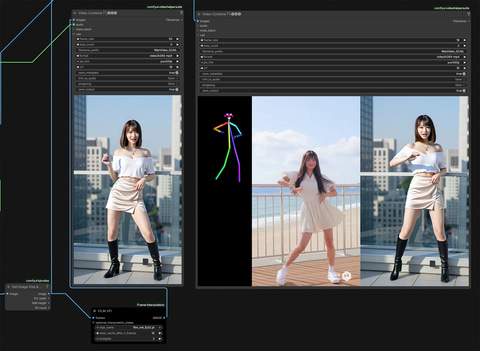 添付したWorkflowで工夫したのは3点。1つはポーズ映像、オリジナル、生成動画の3つを並べて1つの映像にした。ただしこれは16fpsなので動きがガタつく。もう1つはFILM VFIというカスタムノードを使い、30fpsにフレーム補完した上にオリジナルからオーディオ信号を得て完成動画にしたこと。