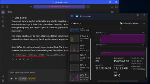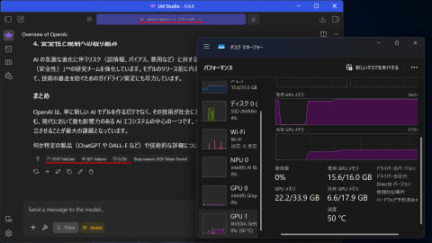 以下のスクリーンショットで、LM Studioとタスクマネージャーの状態を見てほしい。お題はいつもの「OpenAIについて」。