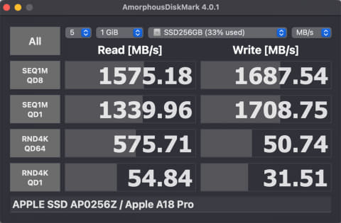 SSDはAmorphousDiskMarkで測定した結果を掲載する。シーケンシャルリード/ライトともに1.5K MB/s程度。今時としては速くない。