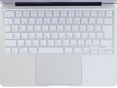 キーボードは日本語配列。過去いろいろなMacBookを所有したがキーボードバックライトなしも含めさすがにこの部分に関しては少し安っぽい。とはいえ同クラスのノートPCと比較した場合、特に悪いわけでなく、逆に価格帯を考えれば十分以上。打鍵感は少し軽め。ただストロークは少し深い。タッチパッドは物理的に沈み込むメカニカルクリックだが、手持ちのMacBook Pro 14と比較してあまり違和感はない。