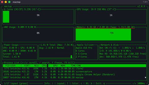 Chromeのタブを9つ開き、mi、LM Studio(Web search mcpあり)、iTerm2とか上げてこんな感じだ。8GB中6.36GB使用、スワップ1.33GB。スワップしているものの、特に引っかかるような感じはない。