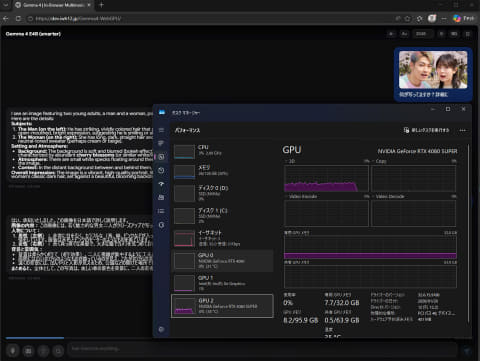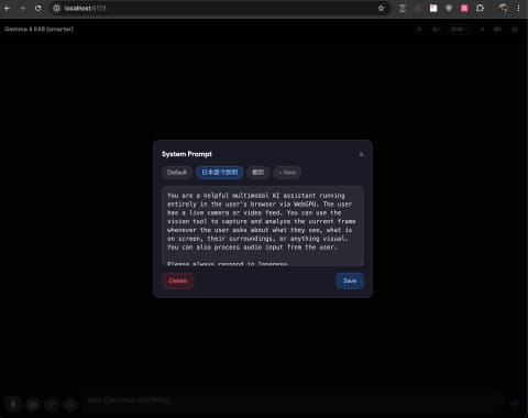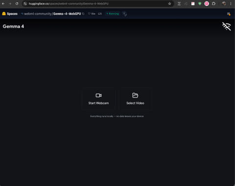 「Gemma-4-WebGPU」は、Googleが先日リリースされたばかりの軽量モデルGemma-4 E2Bに対応したWebGPUチャット。特徴としてはPC搭載のカメラ、マイクが使え、画像と音も入力可能な点。