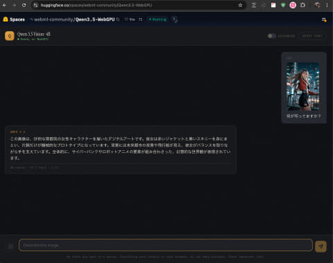 次は「Qweb3.5-WebGPU」で、Alibabaが開発したQwen 3.5 0.8B/2B/4Bを試してみた。Qwen 3.5は0.8Bも含めすべてVision対応なので画像認識が可能。
