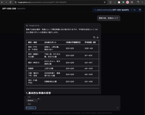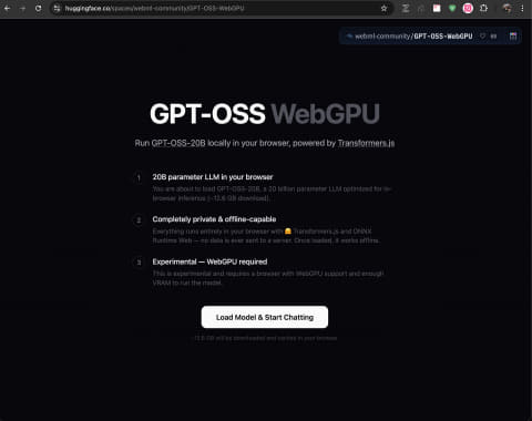 最後は「GPT-OSS-WebGPU」。これはOpenAIが開発したgpt-oss-20bを使ったWebGPUチャット。タイミング的には一番古いものとなる。