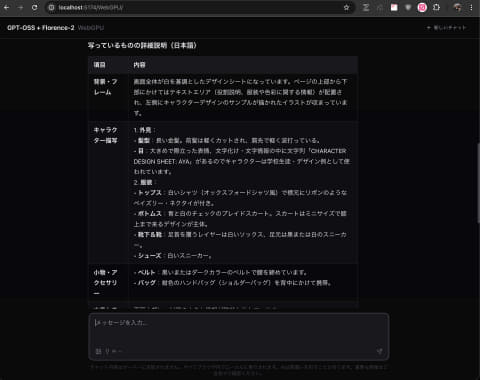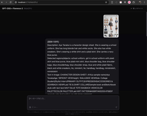 1つ目は、gpt-oss-20bはVision非対応なので画像認識はできない。何か方法はないか?と調べたところ、LLMではなく、画像認識だけするFlorence-2のONNXがあったので、これを組み込んでみた。