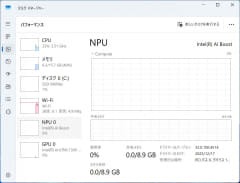 2.5GbEはIntel Ethernet Controller I226-V、Wi-FiはRZ616 Wi-Fi 6E、BluetoothもRZ616。タスクマネージャーにはNPUの項目も見える。