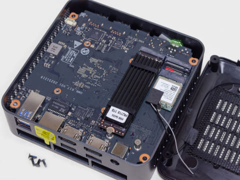 内部にはM.2コネクタが2つあり、1つは装着済み。メモリはもともとプロセッサ内包なので増設はできない。