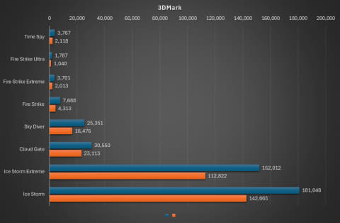 その結果、ザックリ本機のCore Ultra 5 226Vがほぼ全勝!(App Start-upのみ若干劣るがSSDの性能差?)特にGPU関連項目の違いが大きく、3DMarkでは結構の差が付いている。iGPU、Intel Arc 130V GPUの性能が高いのだろう。