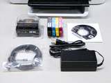 | 付属品一式。ヘッド、インクカートリッジ、ドライバCD、USBケーブル、電源コード、ACアダプタなど | 前面給紙トレイ。幅の調整は左側のスライダーで行なう |