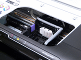 ●セットアップ/ハードウェアハードウェアのセットアップは非常に簡単だ。まず電源ONにすると、ヘッドホルダが自動的に中央で停止するので、プリントヘッドを取り付ける。その後、■▲●の色などに合わせて各色のインクカートリッジをセットする。黒インクだけは他の色と違ってスペースの幅が広く(約3倍)、大容量インクカートリッジも装着可能だ(同梱の黒インクは標準サイズ)。