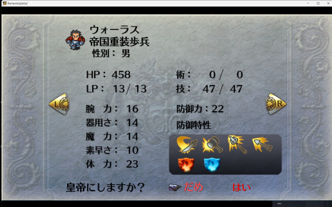 ということで久しぶりに新しい皇帝にチェンジ。新皇帝ウォーラスはとにかく体力がすごい!一目惚れしました(笑)。今パーティーを手放すのは寂しかったのですが、最初の町に戻っていろいろ整えたかったし、まぁいいとするか……。早速仲間を集めて装備などを整え、お金も補充します。