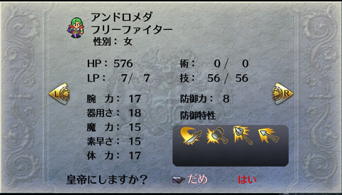 そこで久しぶりに皇帝を変えてみることにしました。毎回思っていますが、今のパーティーがかなりいい感じに仕上がっているので、さよならするのがもったいない……。とりあえず今回も女性の皇帝「アンドロメダ」を選択しました。いつもと同じく「アバロン」でパーティーの仲間を集めたり、装備を整えます。そして再びラッフルツリーに挑みますが、レベルが足りずに完敗。