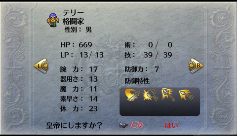 私にしては珍しく、ここで再度皇帝を変えてみました。格闘家の「テリー」です。今までの皇帝とはなんとなく雰囲気が違う男性。パーティーには弓を使う人を入れずに、全員剣が得意な人たちにしてみました。勝手なイメージですが、弓ってあまり強くなさそうなので(笑)。