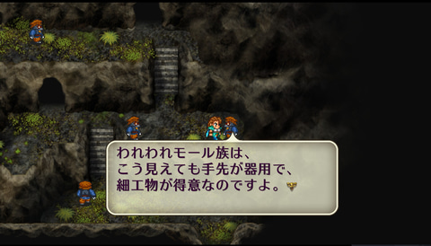 以前、モール族と仲良くなっていたものの、モール族の人数が足りないとのことで、数百年後に飛んだらまた来ようということになっていました。そして時が飛んだので、戻ってきたというわけです。久しぶりにアリの巣に入り、モール族がいたところに戻ると、ちゃんと人数が増えています!しかし、月光のクシを作るための会話にはなりません……。