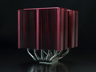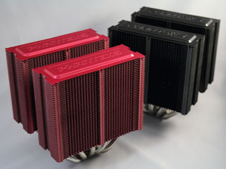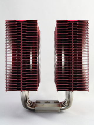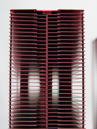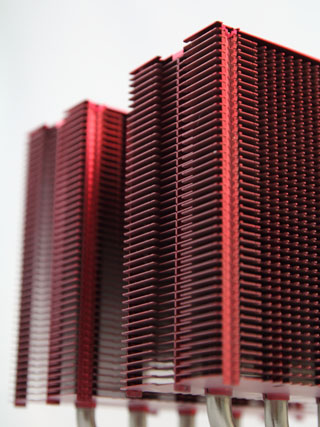PH-TC14PE_RDのヒートシンクは、2ブロックの放熱ブロックを備えたミッドシップレイアウト採用のサイドフロー型ヒートシンクだ。ベースユニットがCPUから受け取った熱は、5本の8mm径ヒートパイプによって放熱部へと運ばれ、放熱ブロックを構成する172枚86組(1ブロックあたり86枚43組)のアルミニウム製放熱フィンによって放熱される。カラーリングを除けば、取り立てて特徴的な要素が無いように見えるPH-TC14PE_RDのヒートシンクだが、放熱フィンとヒートパイプの接続方法に、放熱フィンに開けた穴にヒートパイプを通すというオーソドックスな方法ではなく、2枚の放熱フィンでヒートパイプを挟み込むという、採用例の少ない手法を採っている点はなかなか興味深い。