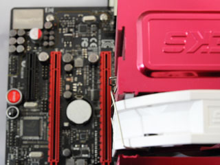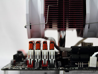 大型のヒートシンクであるため、周辺パーツとのクリアランスにはやや難があり、ASUS MAXIMUS V GENEとの組み合わせでは、拡張スロットの上空にファンクリップが被さったほか、140mm径ファンとメモリのクリアランスがかなり狭くなっていることが確認できた。ファンクリップを絶縁テープで養生したり、ファンをずらして取り付ければ回避できなくもない程度の問題だが、導入に当たっては注意が必要だろう。