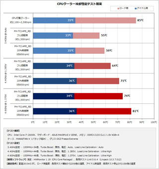 テストの結果、3.4GHz動作時はリテールクーラーの85℃に対し、フル回転時は55℃(-30℃)、20%制御時には59℃(-26℃)をそれぞれ記録し、リテールクーラーから大幅に低いCPU温度を実現している。また、オーバークロック動作時のCPU温度については、4.4GHz動作時はフル回転で64℃、20%制御でも71℃。最もCPUの発熱が大きい4.6GHz動作時でも、フル回転時74℃、20%制御時81℃という結果だった。いずれの条件においても3.4GHz動作時にリテールクーラーが記録した85℃を下回っていること、そして、デュアルファンとはいえ20%制御時のファン回転数が僅か650rpm程度であることを考慮すれば、PH-TC14PE_RDが非常に優れた冷却性能を持っていることが伺える。