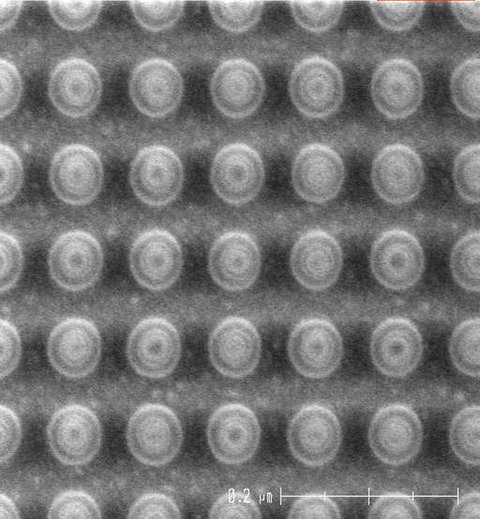 講演では、90nmと極めて狭いピッチで磁気トンネル接合(MTJ)のアレイを製造した状態の電子顕微鏡観察写真を見せていた。