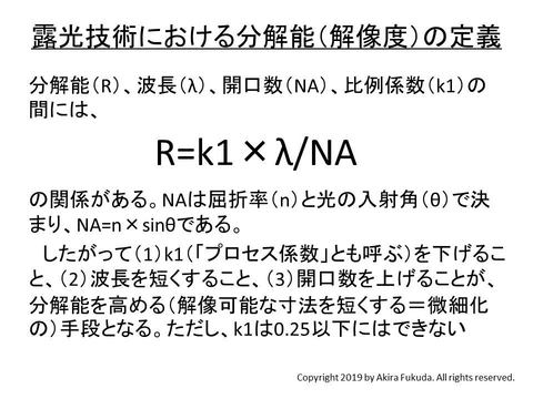 技術ノードの移行は、半導体露光技術の解像度(ハーフピッチ)の向上が牽引する。ArF液浸露光技術やEUV露光技術などにおける解像度(R)は、露光の波長(λ)に比例し、光学系の開口数(NA)に反比例する。すなわち解像度を高めるには、波長を短くするとともに、開口数を大きくすることが必要である。