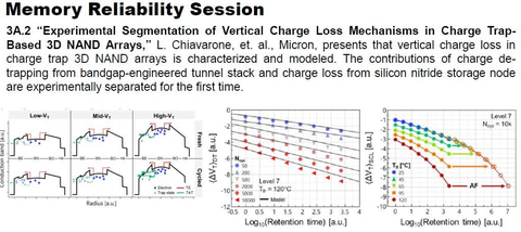 Micron Technologyは、電荷捕獲(チャージトラップ)型3D NANDフラッシュセルアレイで垂直方向の電荷損失メカニズムを議論する(講演番号3A.2)。電荷のデトラッピングによる影響と蓄積ノードにおける損失の影響を初めて分離してみせた。