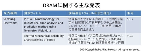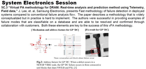続いて「DRAM」である。Samsung Electronicsが披露する2件の研究成果が興味深い。1件は物理解析をせずにDRAMの不良モードと不良要因を推定する仮想的な不良解析システムである(講演番号5C.3)。テレメトリとフィールドデータを活用する。DRAMの品質向上に役立ったという。