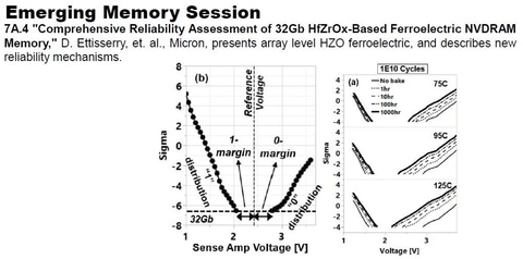 次は「強誘電体メモリ」である。Micron Technologyは、ハフニウムジルコニウム酸化物(HfZrOx)強誘電体キャパシタ(C)による1T1C(1トランジスタ、1キャパシタ)セルの32Gbit大容量不揮発性メモリを試作した(講演番号7A.4)。長期信頼性を測定し、新たなTDDB不良モードを確認した。