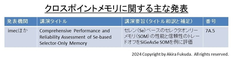 このほか半導体メモリでは、imecなどの共同研究グループが、セレン(Se)系材料のセレクタを使うセレクタオンリーメモリ(SOM)の性能と信頼性のトレードオフを報告する(講演番号7A.5)。セレクタの材料はSiGeAsSe化合物である。