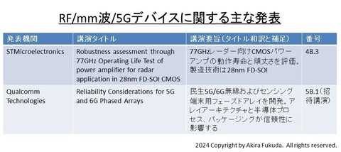 「高周波/ミリ波デバイス」では、STMicroelectronicsが77GHzレーダー向けCMOSパワーアンプの動作寿命と頑丈さを評価した(講演番号4B.3)。製造技術は28nmのFD-SOIプロセスである。Qualcomm Technologiesは、民生5G/6G無線およびセンシング端末用フェーズドアレイを開発した(招待講演、番号5B.1)。アレイアーキテクチャと半導体プロセス、パッケージングが信頼性に影響するという。