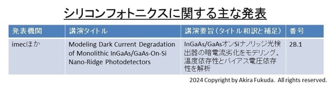 「シリコンフォトニクス」では、imecほかの共同研究グループがInGaAs/GaAsオンSiナノリッジ光検出器の暗電流劣化をモデリングした(講演番号2B.1)。温度依存性とバイアス電圧依存性を解析した結果を発表する。