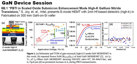 Intelは、直径300mmのSiウェハを利用したGaN-on-Si技術によるサブミクロンのエンハンスメント型GaN MOS HEMTのPBTI特性を検証した(講演番号6B.1)。ゲート絶縁膜はハフニウム系の高誘電率膜で2.15nmと薄い。Si LDMOSと比べてFOMは15倍前後と高い。