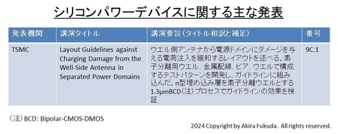 「Siパワーデバイス」でも注目すべき発表がある。TSMCはバイポーラCMOSのウエル側アンテナから電源ドメインにダメージを与える電荷注入を緩和するレイアウトを述べる(講演番号9C.1)。素子分離用ウエル、金属配線、ビア、ウエルで構成するテストパターンを開発し、ガイドラインに組み込んだ。n型埋め込み層を素子分離用ウエルとする1.3μmのBCD(Bipolar-CMOS-DMOS)プロセスでガイドラインの効果を検証した。