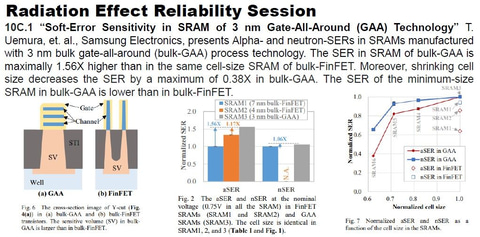 最後は「ソフトエラー」に関する主な発表を紹介しよう。Samsung Electronicsは、3nmノードのバルクGAA FETで製造したSRAMのソフトエラー(アルファ線と中性子線の合計)特性を調べた(講演番号10C.1)。ソフトエラー発生率(SER)は同じセルサイズのバルクFinFETに対して1.56倍と高い。
