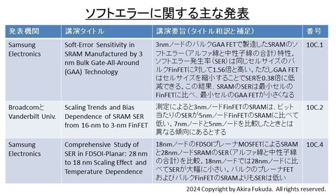Broadcomと Vanderbilt Universityの共同研究チームは、3nmノードのFinFETによるSRAMソフトエラーと5nmノードのFinFETによるSRAMのソフトエラーを実測で比較した(講演番号10C.2)。3nmノードFinFETのSRAMは、ビット当たりのSERが5nmノードFinFETのSRAMに比べて低い。7nmノードと5nmノードを比較したときとは異なる傾向にあるとする。